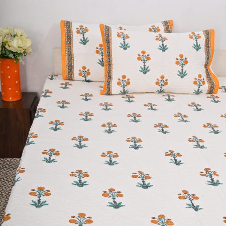 Marigold Block Printed Quilted Bedcover with Pillow Covers
