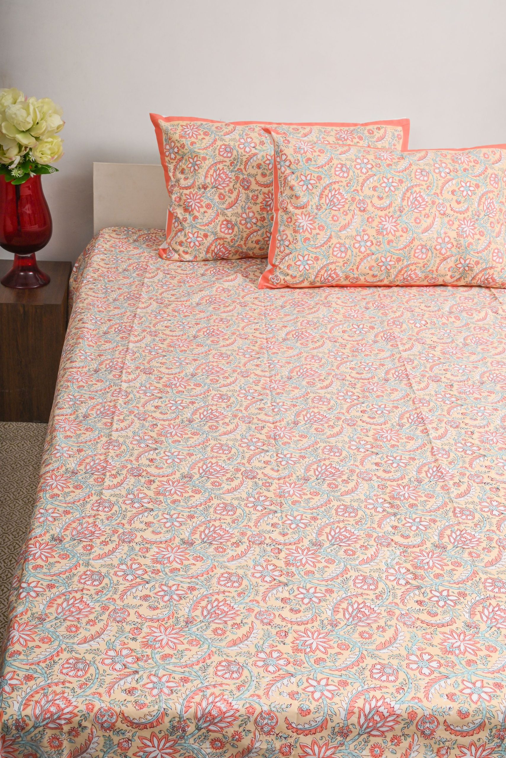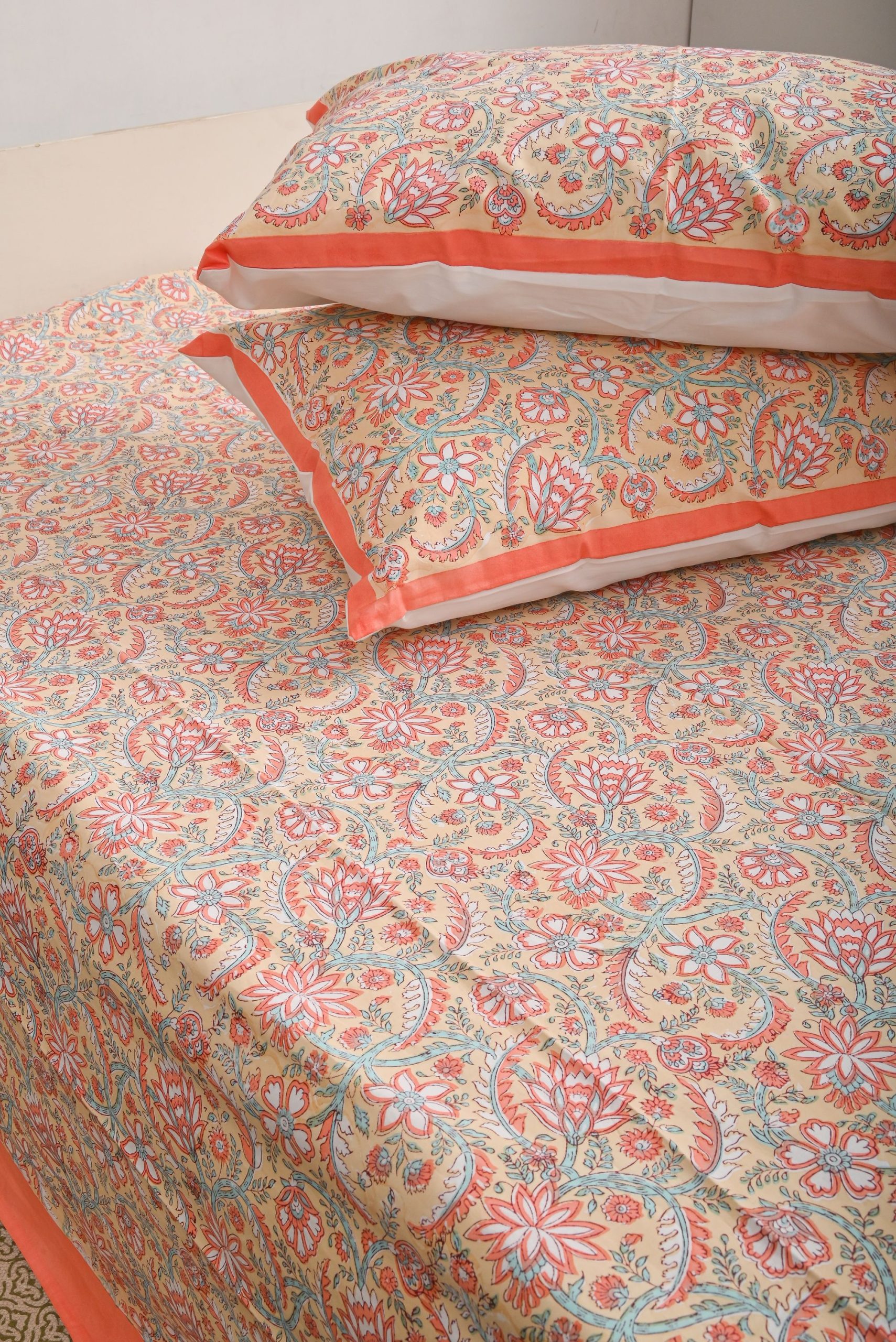 100% cotton Hand Block Printed Bedsheets with matching pillow covers. Enhancing the beauty of your body and soul with this designer product by ABEER .